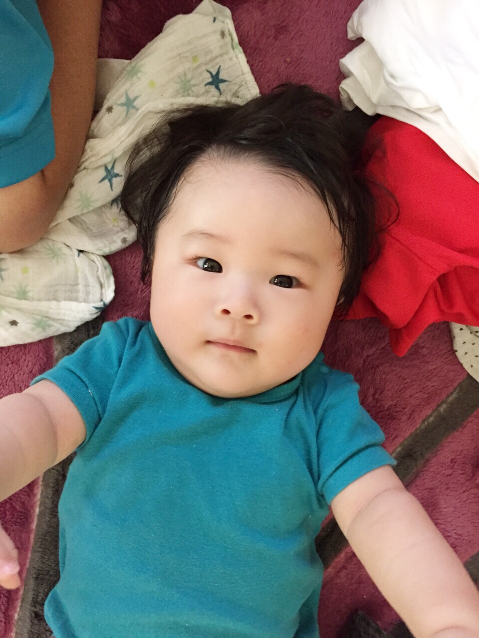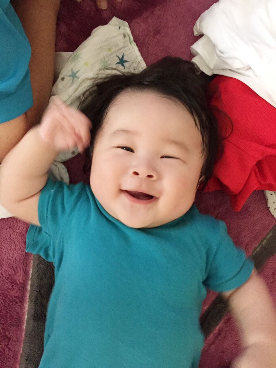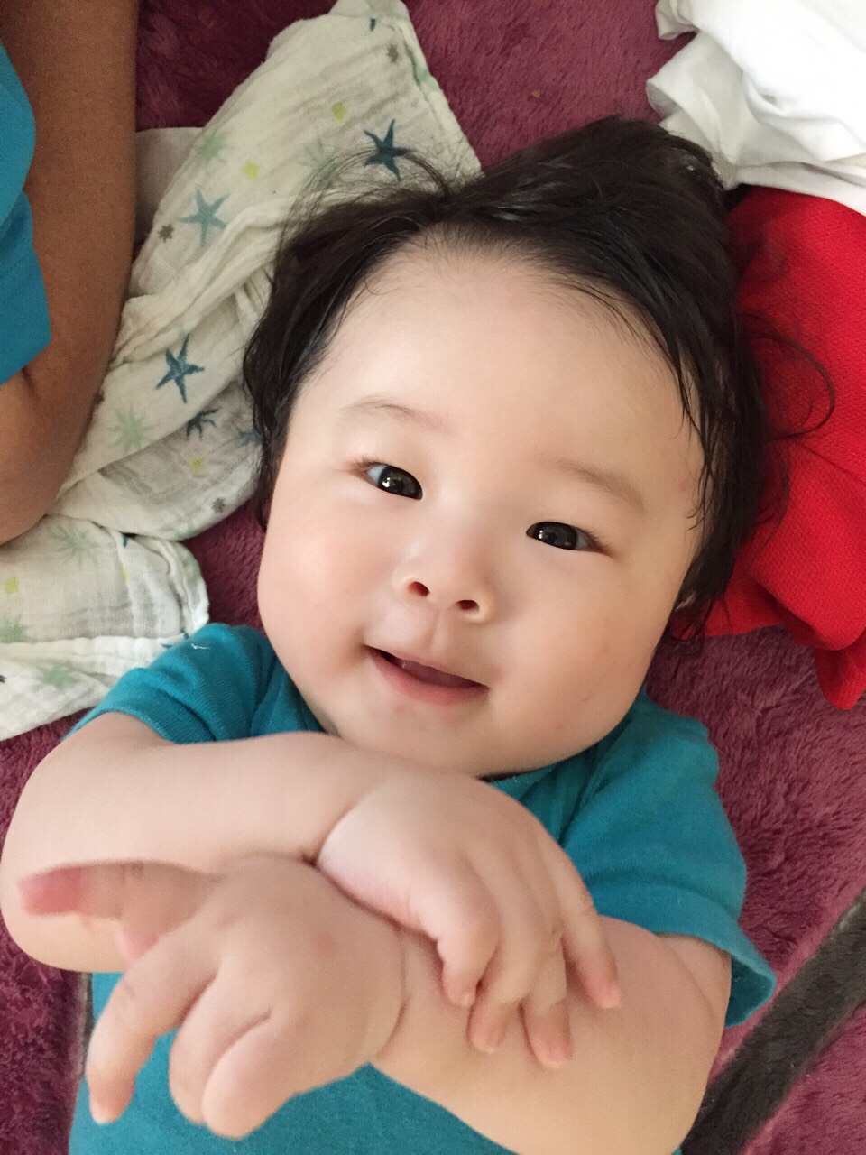 下の歯が2本生えてきました。その為か「ぶーぶーぶー」って唇を震わしたり、変顔してます。下唇が鼻につきそう・・・。それにしても肌の色が真っ白、美肌男子だ!?